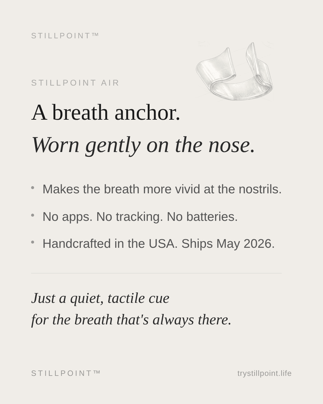 Still Point is a small, soft, nose-worn breath anchor that rests gently on the outside of the nose — never entering the nostrils — amplifying the felt sensation of every breath by redirecting airflow into converging streams on the inhale and warm rising plumes on the exhale. It was designed for meditation and breathwork, where a more vivid breath signal makes it easier to focus on, settle into, and return to when the mind drifts. Beyond formal practice, Still Point is equally at home supporting nervous system settling between tasks — a quiet reset in the middle of a busy day — and as sleep support, helping you drift off more easily or find your way back to sleep when a restless mind wakes you in the night.